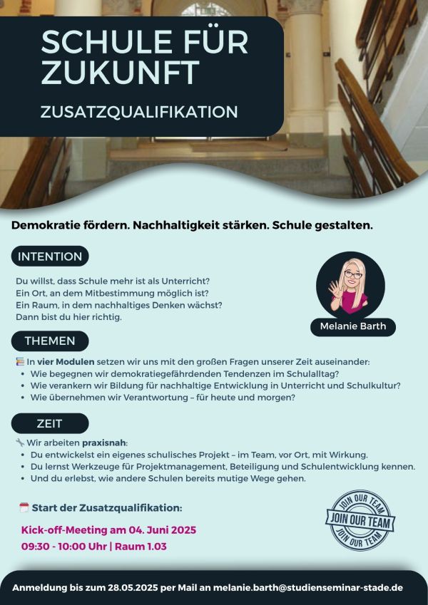 In der Zusatzqualifikation „Schule für Zukunft“ setzen sich Lehrkräfte im Vorbereitungsdienst mit den Grundlagen demokratischer Schulentwicklung auseinander. Sie lernen, wie Schule als demokratischer Erfahrungsraum gestaltet werden kann – sowohl im Unterricht als auch im Schulalltag.